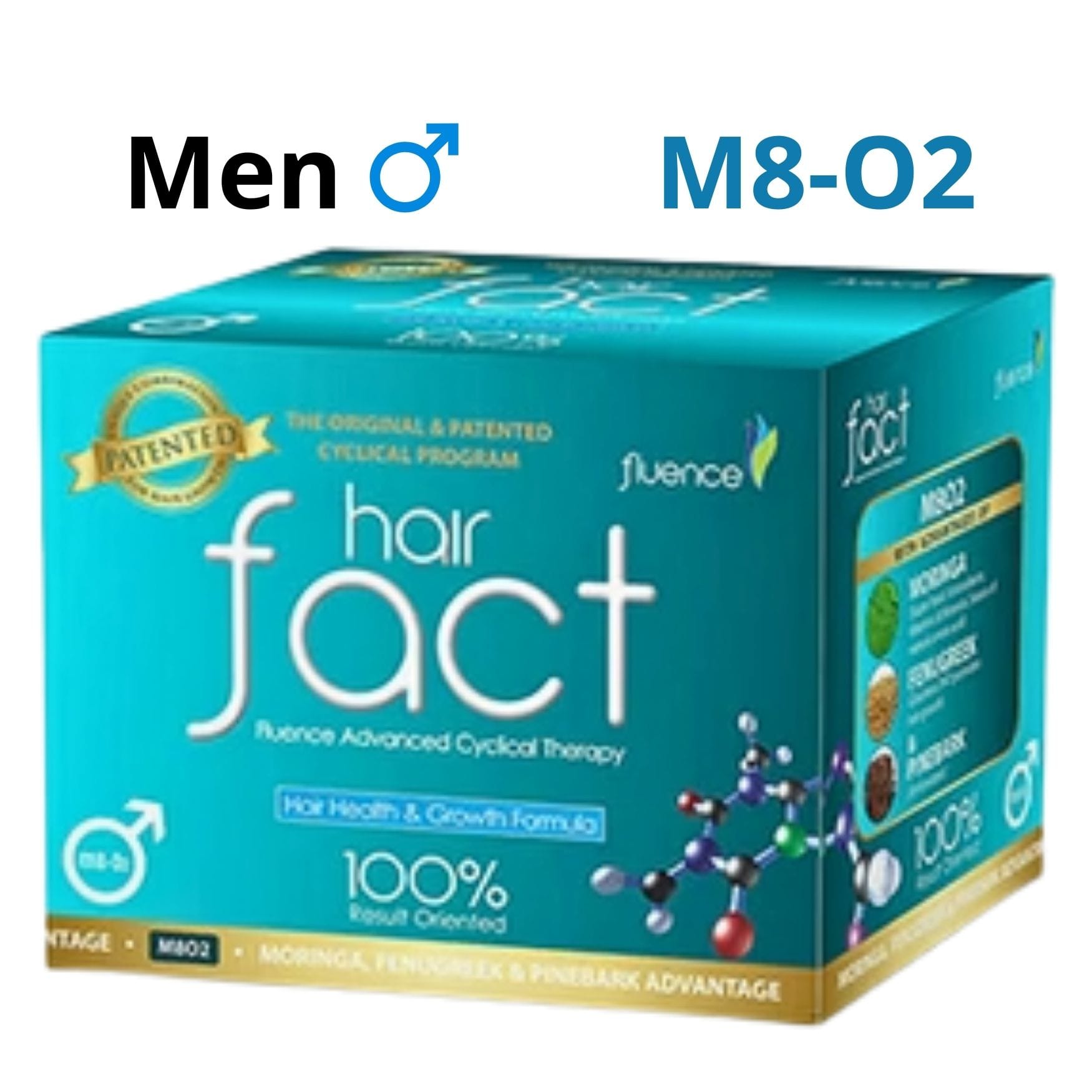 Hair Fact Fluence Advanced Cyclical Therapy (Men) M8-O2 is a premium oral nutraceutical developed for men experiencing advanced hair thinning, excessive shedding, and scalp stress. This formula focuses on combating oxidative stress, enhancing follicle function, and promoting denser, more resilient hair. Its scientifically structured cyclical therapy model delivers targeted nutrients at optimal phases of the hair growth cycle (anagen, catagen, telogen) to maximise absorption and support.